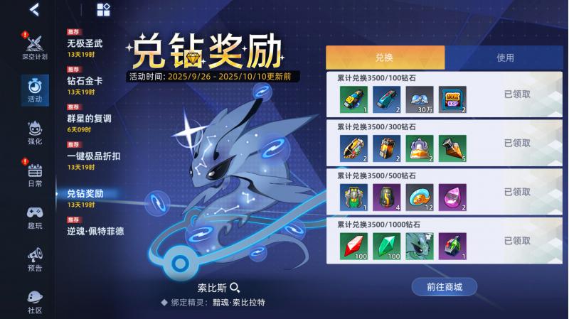 累计兑换1000钻石,即可领取黯魂·索比拉特经典皮肤!