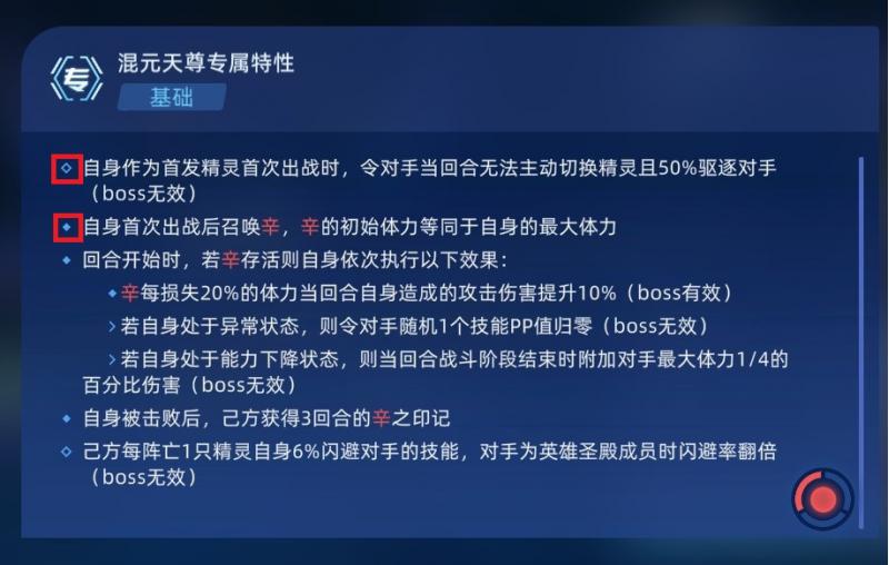 专属特性中我们引入全新的符号来表示该条特性是否能在boss对战中生效,现在你可以通过每条特性前的符号是否实心来进行判断,实心代表boss有效,空心代表boss无效