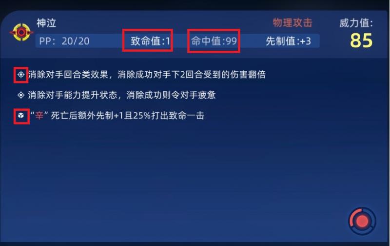 每条技能效果前新增了全新的符号,这将区分这条效果是需要命中生效才能触发还是固有效果,比如“神泣”中“辛”死亡后额外先制+1且25%打出致命一击的效果即是固有效果
